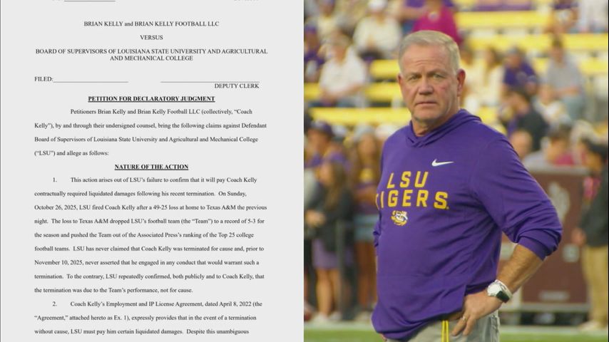 The lawsuit says LSU initially fired Kelly because of team performance, but the school is now looking to claim cause for his termination. It also says he was only recently told about being terminated for cause and that LSU missed the window to show cause.