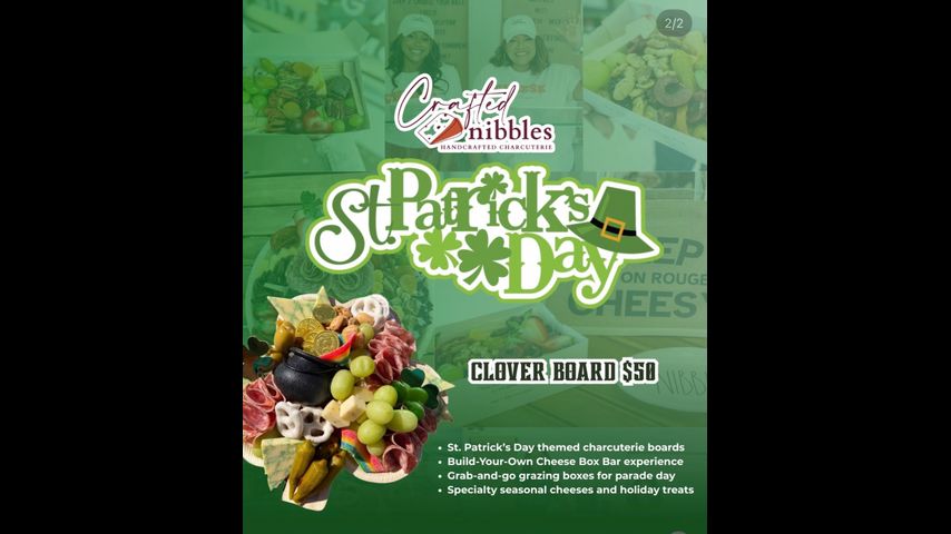 BATON ROUGE - Crafted Nibbles BR, a Baton Rouge-based, women-owned charcuterie and catering business, is hosting a St. Patrick’s Day Block Party at its storefront on Perkins Road in celebration of the holiday weekend.