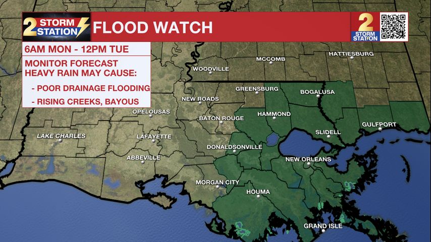 The National Weather Service has issued a ***FLOOD WATCH*** for Ascension, Assumption, Livingston, St. James, and Tangipahoa Parishes. It will go into effect at 6 a.m. Monday and last through Noon Tuesday. A FLOOD WATCH means conditions may develop that lead to flash flooding. Flash flooding is a very dangerous situation. Be on the lookout for threatening weather conditions and listen for later statements and possible warnings. For more on flooding safety, CLICK HERE.