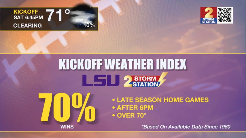 Up Next: The warm pattern continues through the weekend as a weak ridge builds overhead on Saturday. For Saturday’s LSU Game, very warm, temps in the upper 70s to low 80s during tailgating. Perhaps a spotty thundershower. Mild and humid during the game with temps falling into the upper 60s. Fog may redevelop late Saturday night into Sunday morning.
