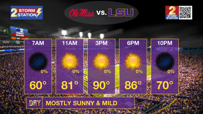Saturday & LSU Football: You may want a light jacket for tailgating on Saturday morning. However, extra layers will be shed and short sleeves will be just fine throughout the day as sunshine pushes temperatures into the upper 80s during for afternoon highs. As LSU takes on Ole Miss at 6:30pm in Tiger Stadium, temperatures will be in the upper 70s around kickoff. The LSU Kickoff Weather Index shows the Tigers winning 69% of October home games after 6pm when temperatures are below 80 degrees.
