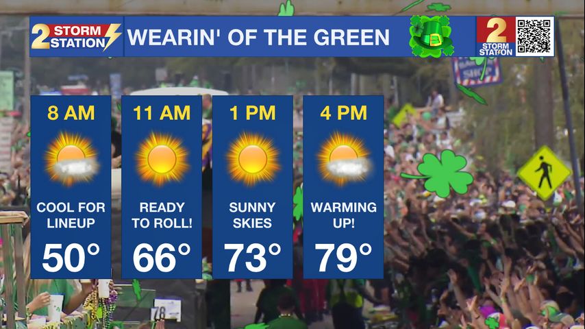 Wearin’ of the Green: After a clear and calm night, morning temperatures will be in the upper 40s. Some light layers might be wanted early, but have a plan to stash them. As the parade is starting to roll, thermometers will be rising through the 60s and into the 70s. Ultimately, afternoon temperatures will end up in the upper 70s. Through the day, skies will stay mainly clear, so grab some sunscreen and sunglasses.