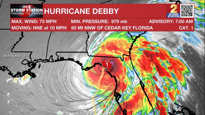 Debby will reach southern Georgia by Monday night and then slow its forward motion by midweek, stalling over the Southeast Coast. This will bring enormous amounts of rain to coastal Georgia, South Carolina, and North Carolina. Flooding is likely in those areas, even with Debby weakening to tropical storm status. No direct impacts are expected in Louisiana at this time.