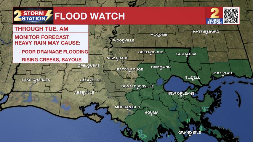 The National Weather Service has issued a ***FLOOD WATCH*** for Ascension, Assumption, Livingston, St. James, and Tangipahoa Parishes. It will be in effect Monday and last through Tuesday morning. A FLOOD WATCH means conditions may develop that lead to flash flooding. Flash flooding is a very dangerous situation. Be on the lookout for threatening weather conditions and listen for later statements and possible warnings. For more on flooding safety, CLICK HERE.