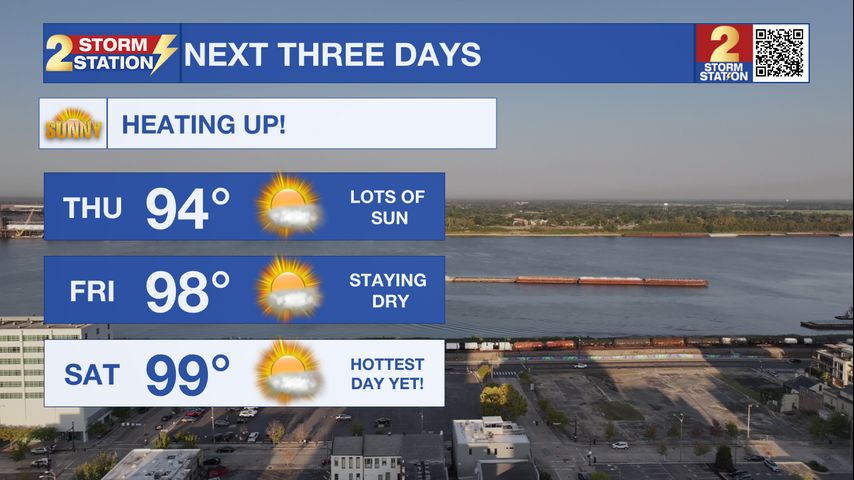 Up Next: Though each morning over the weekend will begin in the 70's, afternoon temperatures Friday and Saturday will be very hot. A forecasted high of 98° on Friday and 99° on Saturday will mark two of the warmest days of the year so far. Heat index values both day's will top out over 100° so be extremely cautious if spending excess time outdoors this weekend. Drinking extra water, wearing light clothing, and taking many breaks inside to cool off are all recommended to avoid heat-related injuries.