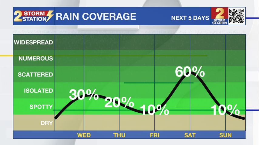 Up Next: You can expect more of the same weather pattern to carry us through the rest of the week. Each morning will start off mild, with lows in the 50s and some areas of fog. By the afternoon, we’ll see a mix of clouds and sunshine with highs reaching the mid to upper 70s. A weak disturbance arriving early Wednesday should increase cloud cover and keep fog more patchy that morning. That same feature could also spark a few isolated showers, though the midweek setup is minor compared to the stronger system expected this weekend.