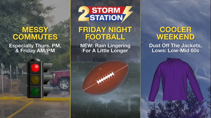 Up Next: A weak front will start to push through from north to south Friday night, swiping the thick moisture away from the region and ending precipitation. The trends suggest some rain could linger into a few high school football games but should be wrapping up as the games do. It would be a good idea to take a poncho to your game of choice. It will be cool on Friday night with temperatures in the mid-70s.